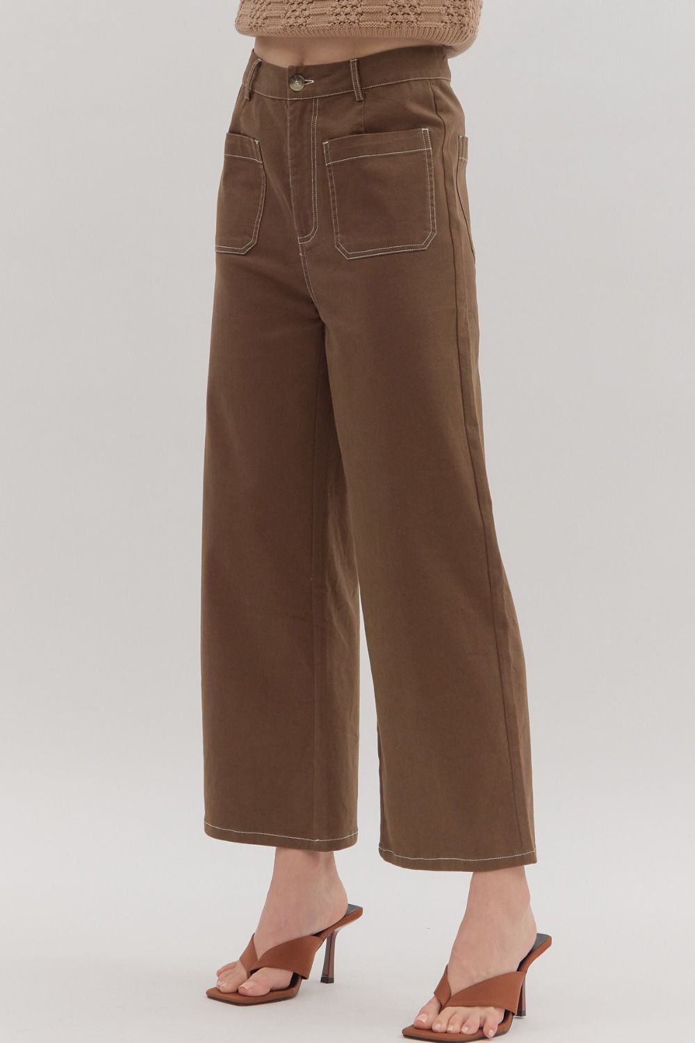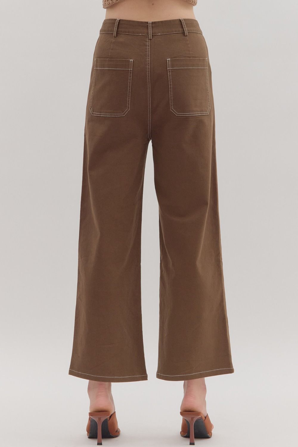 Solid brown high-waist button fly-front zipper closure pants featuring exposed stitch detail. Patch pockets at front and back. Unlined. Woven. Non-sheer. Lightweight.