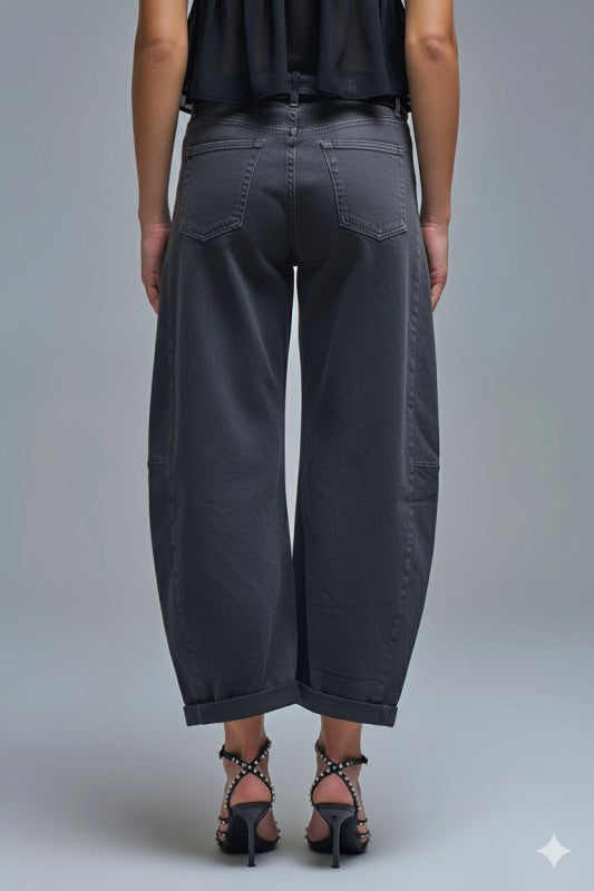Elevate your style with these fashionable gray barrel balloon jeans. They feature functional pockets both in the front and back blending comfort with practicality. The zipper closure ensures a snug fit while the chic sandy hue complements any outfit.