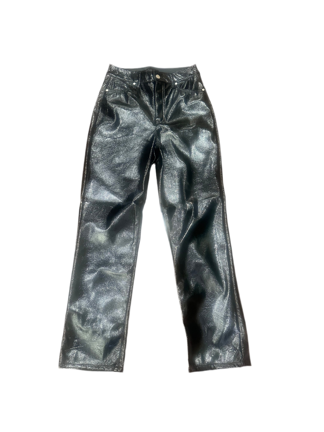 Command attention in these sleek black patent faux-leather pants. Designed with a flattering high rise and structured straight-leg silhouette, they feature a glossy finish that catches the light with every move. Perfect for styling with everything from an oversized knit for daytime edge to a strappy heel and bodysuit for a night out, these pants are the ultimate statement piece to elevate your look.