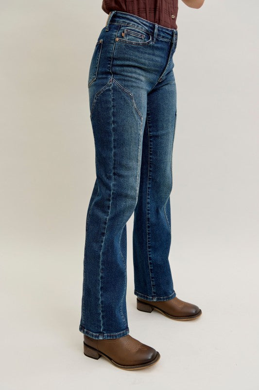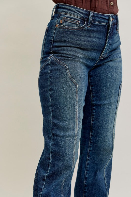 These dark wash jeans feature a flattering high-rise fit with unique angled seam detailing along the front for a modern Western-inspired look. Designed with a straight leg and just the right amount of stretch, they offer both comfort and structure. Perfect for pairing with boots or sneakers, these jeans bring effortless style to any outfit — from casual days to a night out.