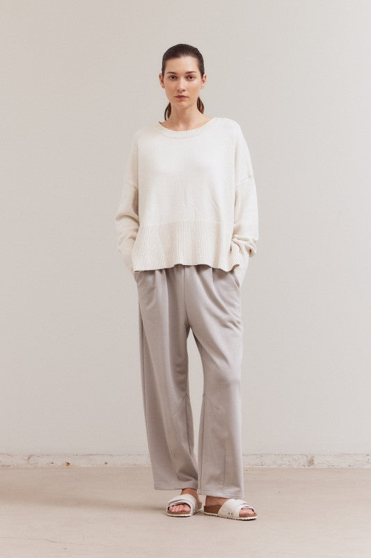 clean, effortless style to your everyday wardrobe. Designed with a relaxed silhouette and dropped shoulders, it drapes beautifully while still feeling structured. The wide ribbed hem and extended ribbed cuffs add just the right amount of detail, giving this simple knit a refined, elevated finish. Easy to pair with denim, trousers, or lounge pants — it’s the timeless staple you’ll reach for again and again.