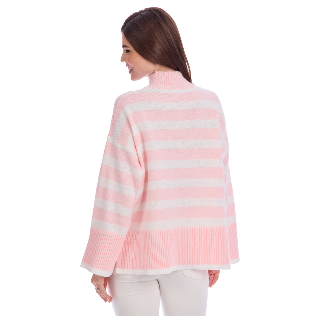 The Costner Striped Sweater is a stylish and versatile addition to any wardrobe, offering a chic and modern look with its classic striped pattern. Crafted from 100% polyester, this knit sweater ensures a soft and comfortable fit, perfect for all-day wear. The ribbed sleeve openings and hem add a touch of texture and sophistication, while the side slit detail provides a contemporary edge and ease of movement. Designed to be a one-size-fits-most piece, it measures approximately 26 1/2" from shoulder to hem, making it an ideal choice for layering over your favorite tops or pairing with jeans for a casual yet polished ensemble.
