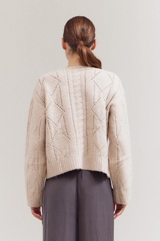 The Diamond Stitch Sweater brings soft texture and classic charm to your winter wardrobe. Featuring a relaxed fit, delicate open-knit diamond detailing, and a flattering V neckline, it’s the kind of piece that looks polished without even trying. The ribbed hem and cuffs add structure, balancing perfectly with the sweater’s cozy, easygoing drape. Pair it with denim, wide-leg trousers, or skirts for an effortlessly chic look.