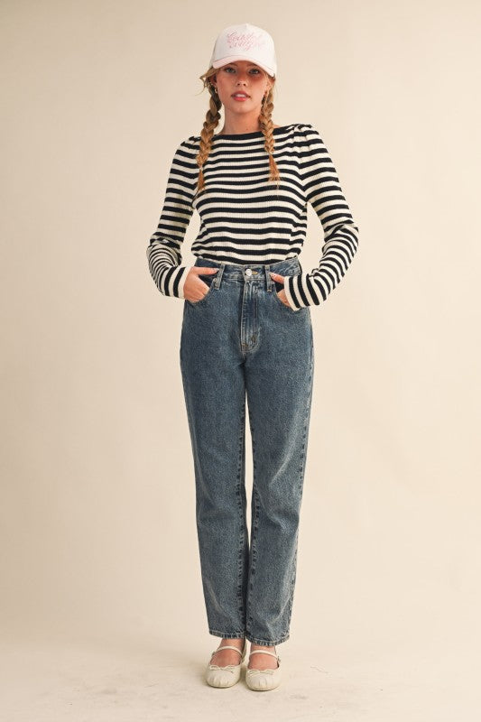 Navy/white ribbed striped sweater featuring boat neckline, gathered puff sleeves, and waist length fit.