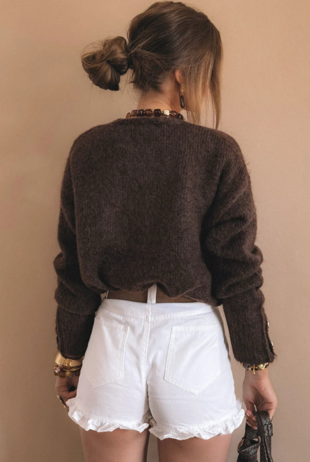 The sweater is a cozy, long-sleeved design in a deep chocolate brown shade, featuring a soft, textured knit fabric. It has a V-neckline and is adorned with distinctive heart-shaped buttons in varying neutral tones, placed down the front and along the cuffs for added charm. The fit is relaxed and slightly oversized, providing comfort and effortless style ideal for cooler days