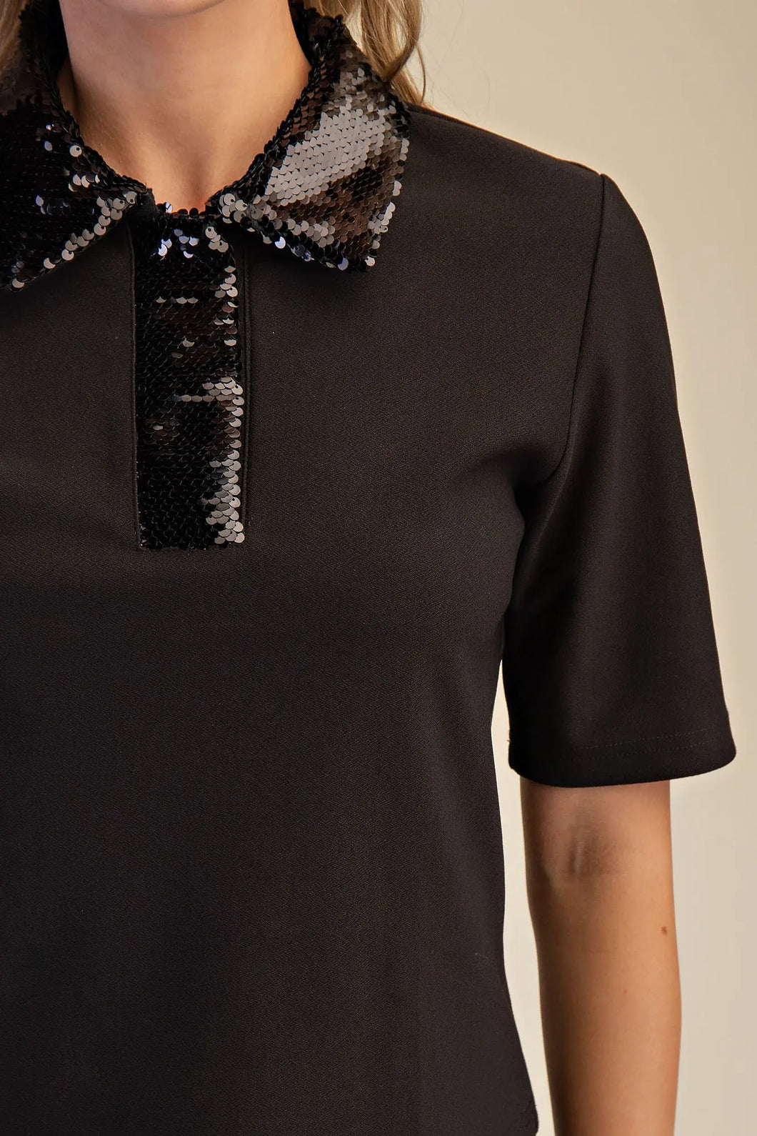 evate your everyday black top with a touch of after-dark sparkle. The Midnight Spark Polo Top features a sleek, tailored silhouette balanced with a statement sequin-trimmed collar and placket for that subtle glam moment. Soft, structured knit fabric keeps it polished yet comfortable, while the short sleeves make it an easy year-round piece. Dress it up with trousers or add denim for a chic, effortless shine—this top does all the work for you.