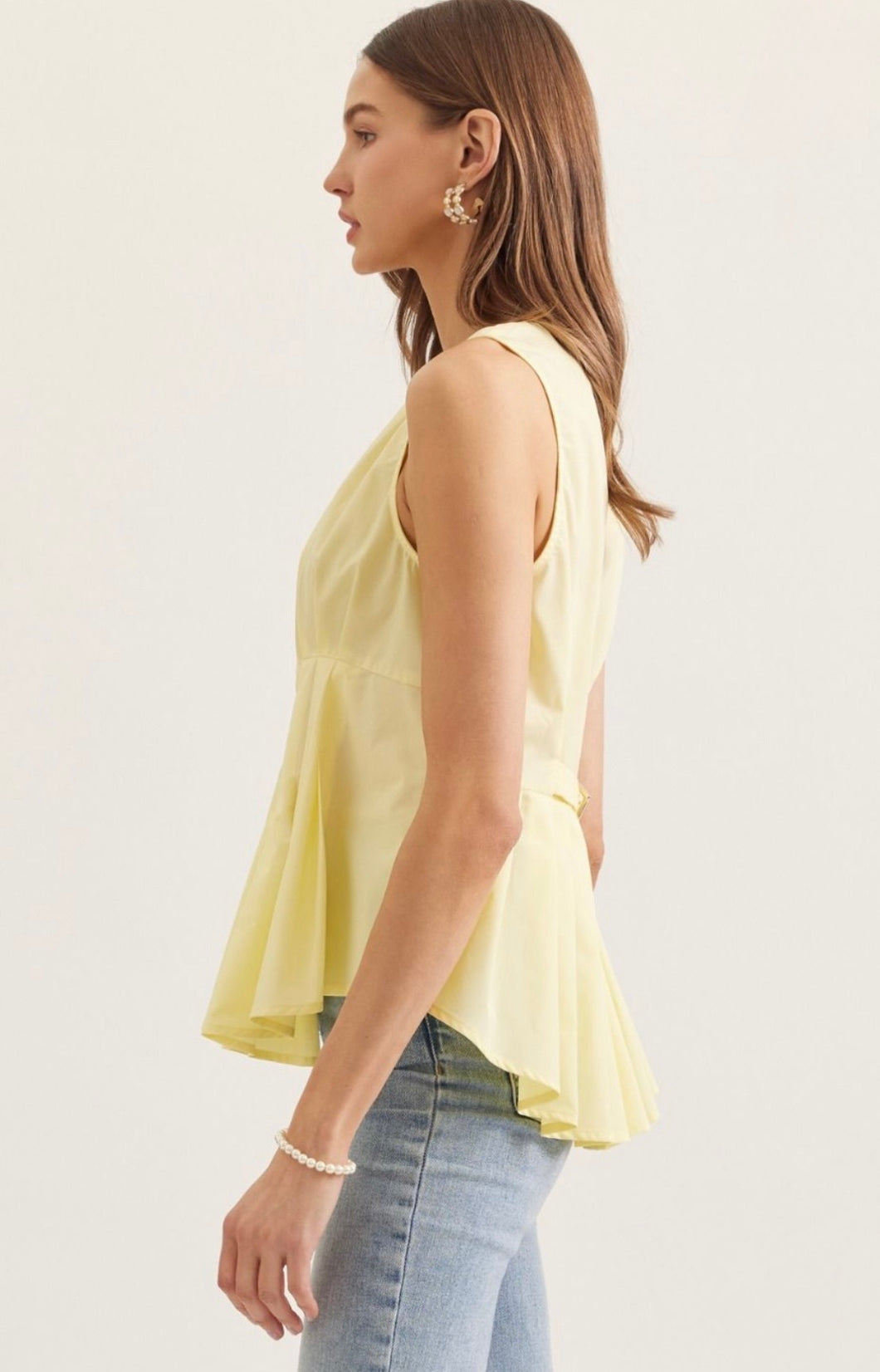 Brighten your wardrobe with the Sunlit Pleated Peplum Top, a feminine and effortlessly stylish piece designed to elevate everyday looks. Crafted in a soft, light yellow fabric, this sleeveless top features delicate pleated detailing that creates beautiful movement and texture.