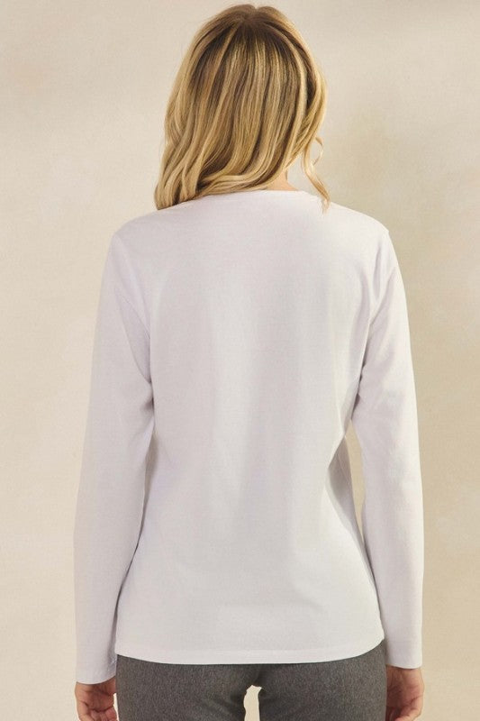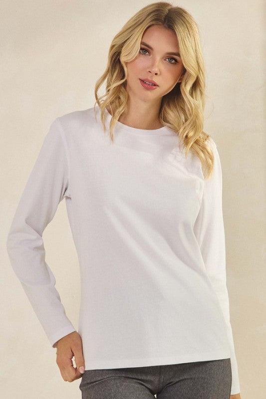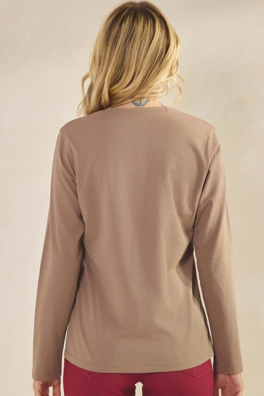 everything. The Foundation Tee is your must-have long sleeve—lightweight, smooth, and perfect for layering under cardigans, jackets, and all your cozies. Its easy, flattering fit also makes it chic enough to wear on its own. Available in three timeless shades: crisp white, rich mocha, and classic black.