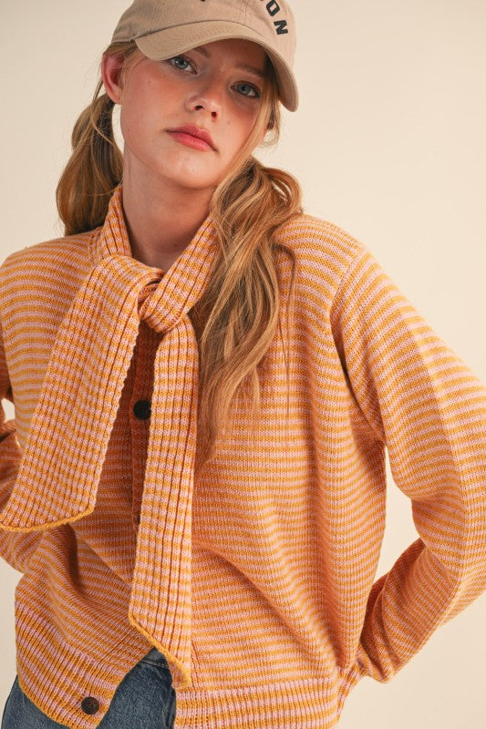 Pink and orange striped cardigan sweater featuring self tie neck, button down placket, and ribbed cuffs. Casual fit.