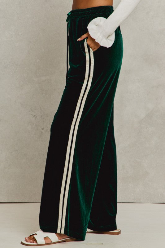 These statement-making track pants combine sporty style with luxe texture. Crafted from rich green velvet, they feature a relaxed silhouette with a fluid drape for all-day comfort. A crisp white athletic stripe runs down each leg, adding a retro-inspired track detail that balances casual and chic. Perfect for dressing up with heels or keeping it laid-back with sneakers.